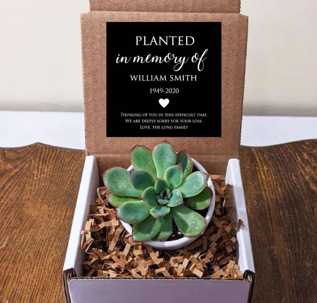 This listing is for a memorial gift succulent with a personalized message. The succulent comes planted in a white pot.